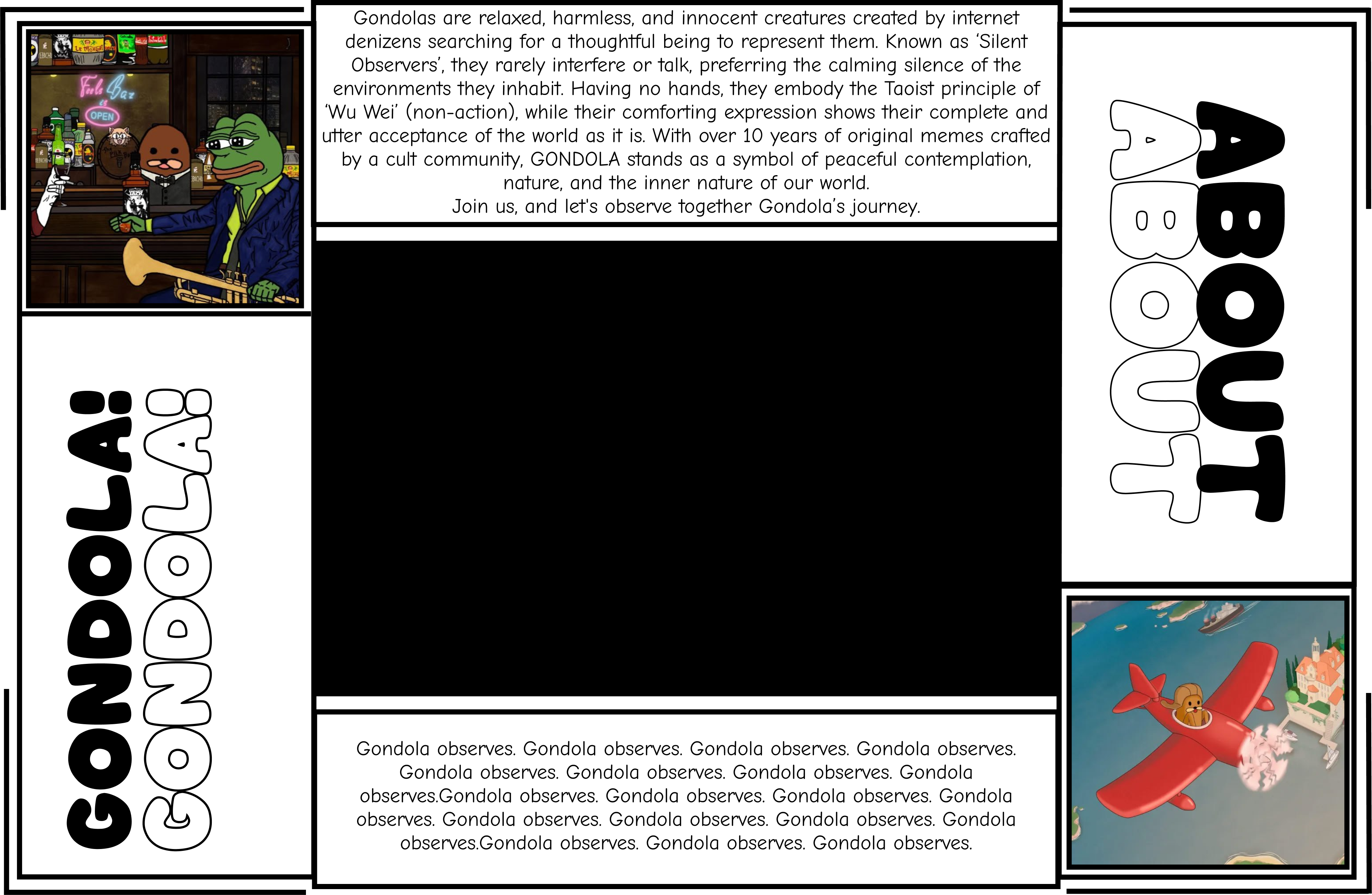 Gondolas are relaxed, harmless, and innocent creatures created by internet denizens searching for a thoughtful being to represent them. Known as ‘Silent Observers’, they rarely interfere or talk, preferring the calming silence of the environments they inhabit. Having no hands, they embody the Taoist principle of ‘Wu Wei’ (non-action), while their comforting expression shows their complete and utter acceptance of the world as it is. With over 10 years of original memes crafted by a cult community, GONDOLA stands as a symbol of peaceful contemplation, nature, and the inner nature of our world. Join us, and let's observe together Gondola’s journey.